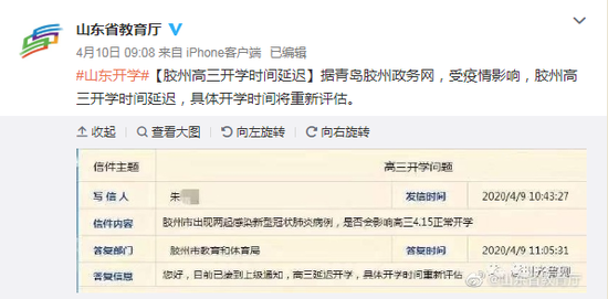 早在4月10日,据@山东省教育厅 消息,受疫情影响,山东胶州高三开学时间延迟,具体开学时间将重新评估。