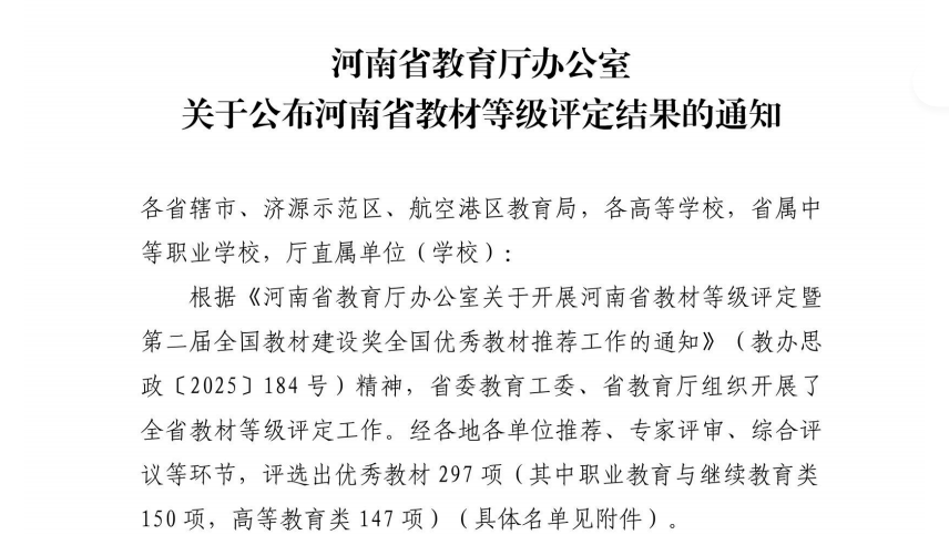 近日,河南省教育厅办公室正式发布《关于公布河南省教材等级评定结果的通知》(教办思政〔2025〕259号),郑州升达经贸管理学院推荐申报的《投融资决策分析》荣获河南省教材等级评定二等奖。此次获奖是该校在教材建设领域的又一重要突破,彰显了学校在高质量教材建设方面的显著成效。