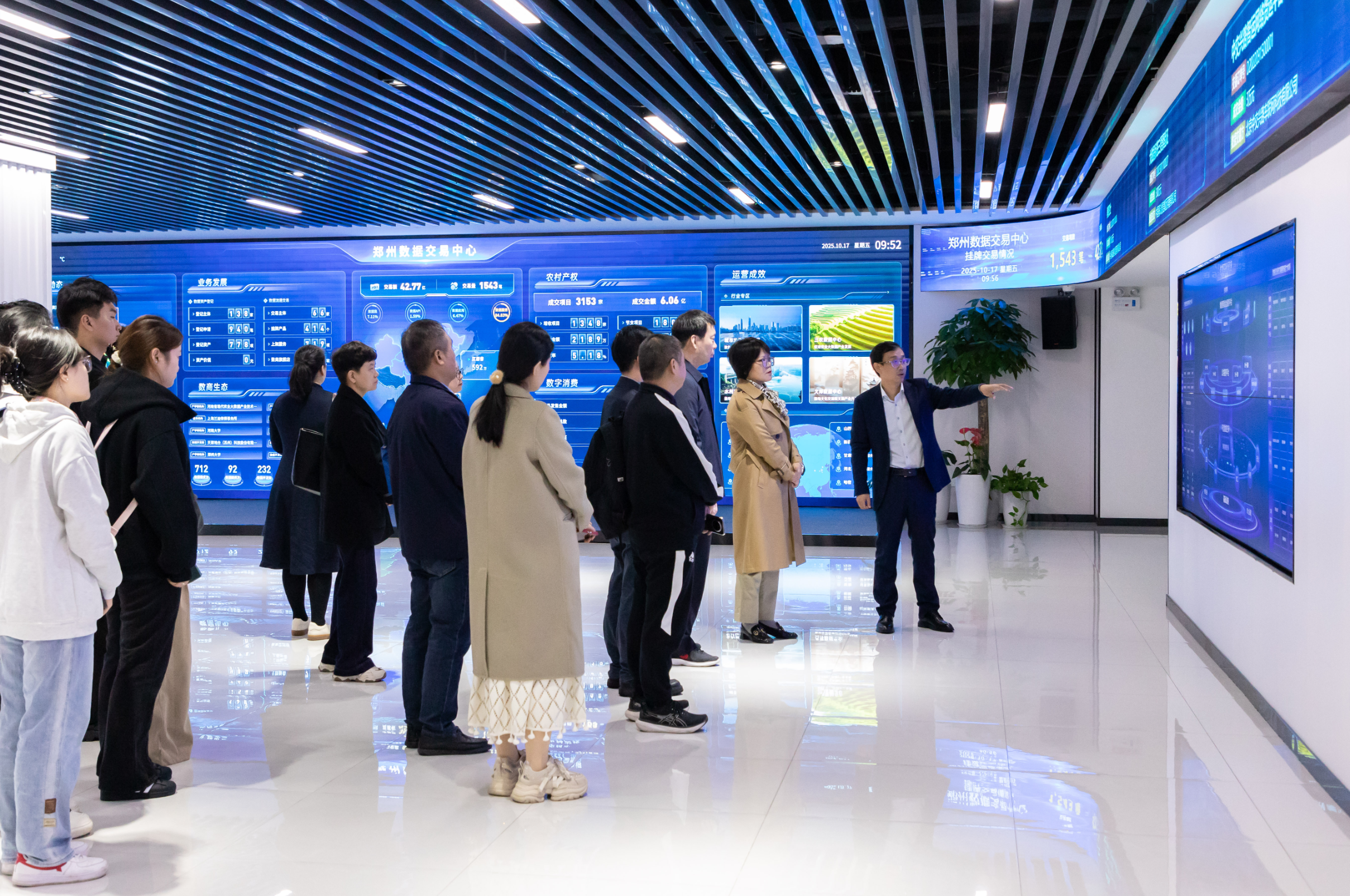 当日上午,参访团队到达郑州数据交易中心。在郑州数据交易中心总经理潘新民的陪同下,张欣一行参观了郑州数据交易中心展厅。大家通过丰富的展示内容和先进的展示手段,深入了解数据交易的前沿技术和行业动态,对数据在现代经济中的重要作用有了更为直观和深刻的认识。