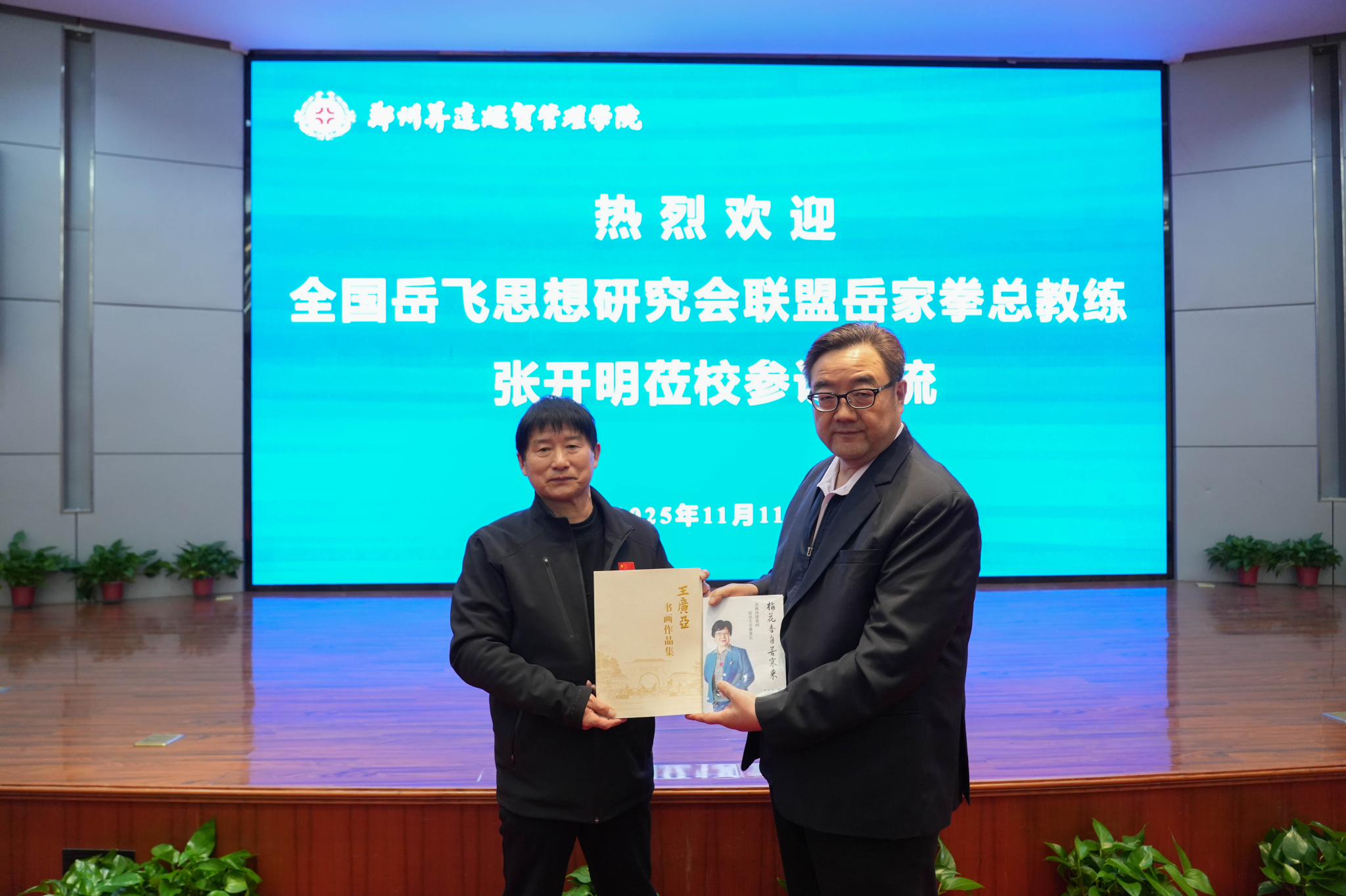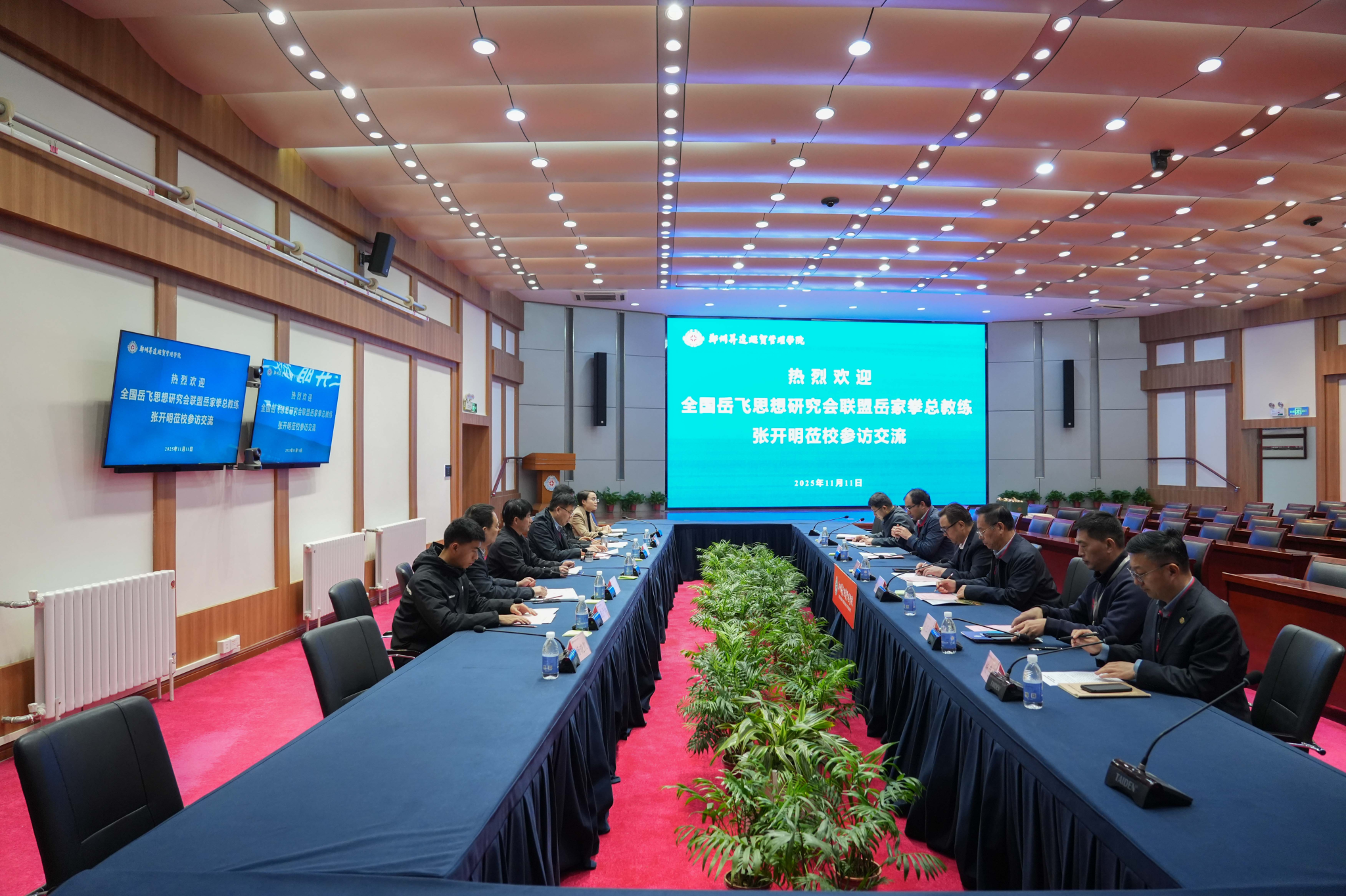 2025年11月11日上午,全国岳飞思想研究会联盟岳家拳总教练张开明先生一行莅临郑州升达经贸管理学院参访交流。活动在行政楼国际会议厅举行,郑州升达经贸管理学院学校董事长王新奇博士,党委副书记、副校长张金安,登封校区党工委书记沈定军及部分主管共同出席。会议由校地合作处处长王彦雨主持。