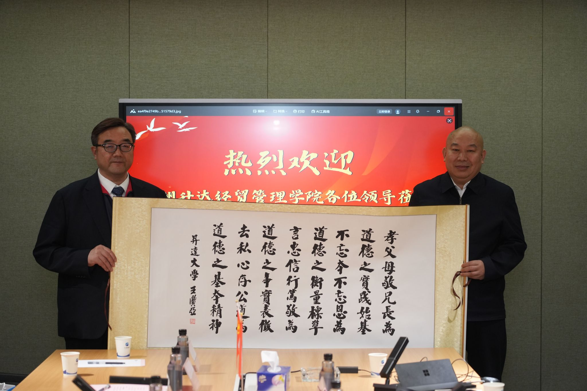 王新奇代表学校向张建生赠送创办人王广亚博士书画作品,并合影留念。